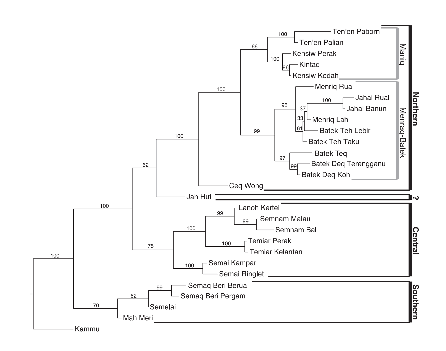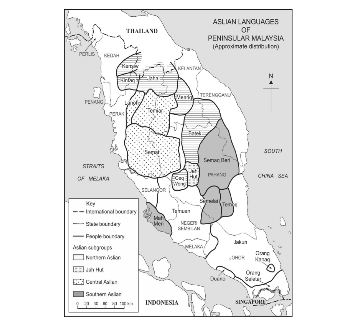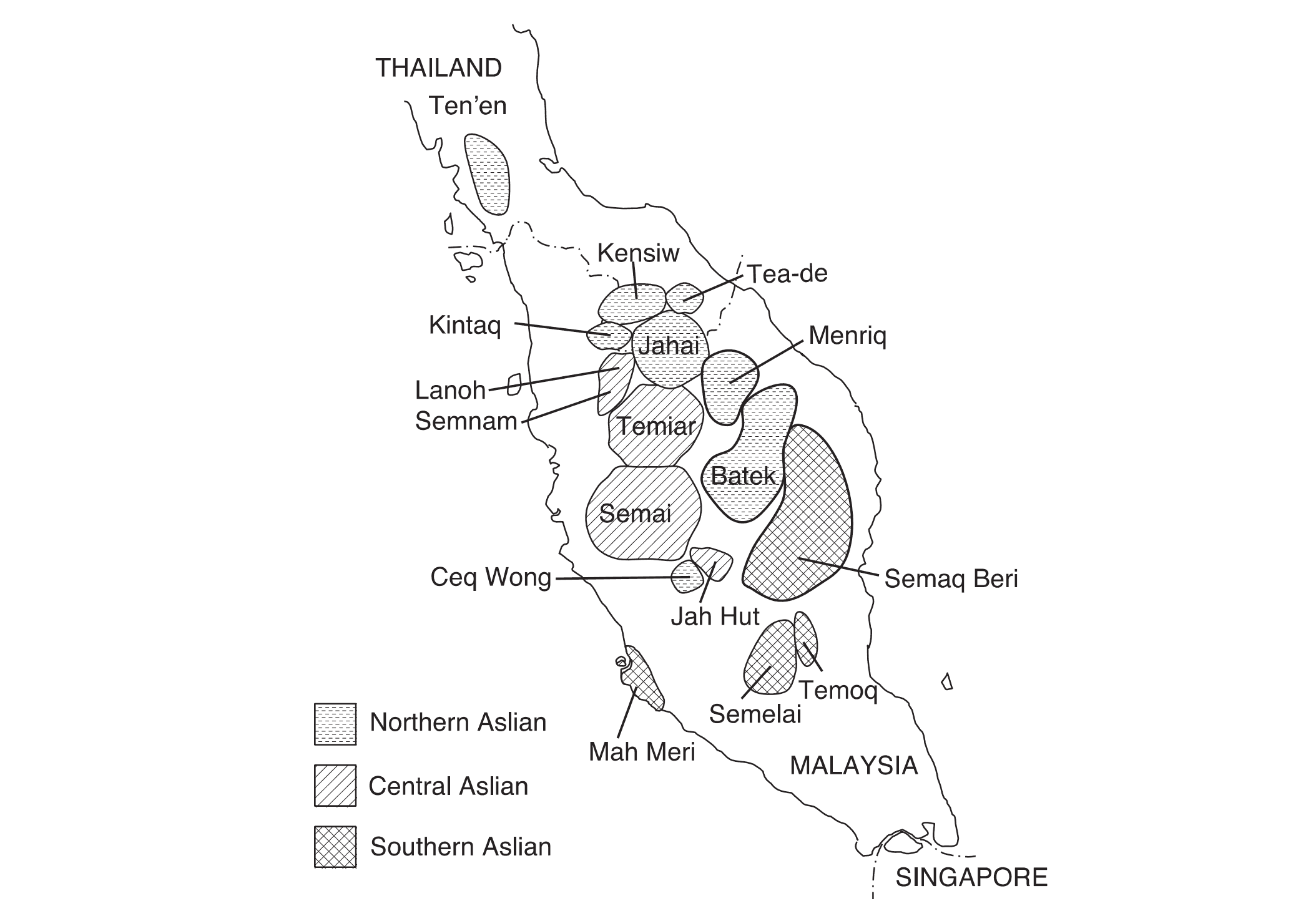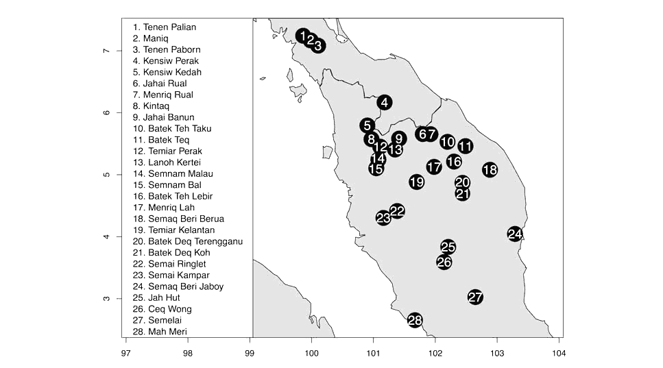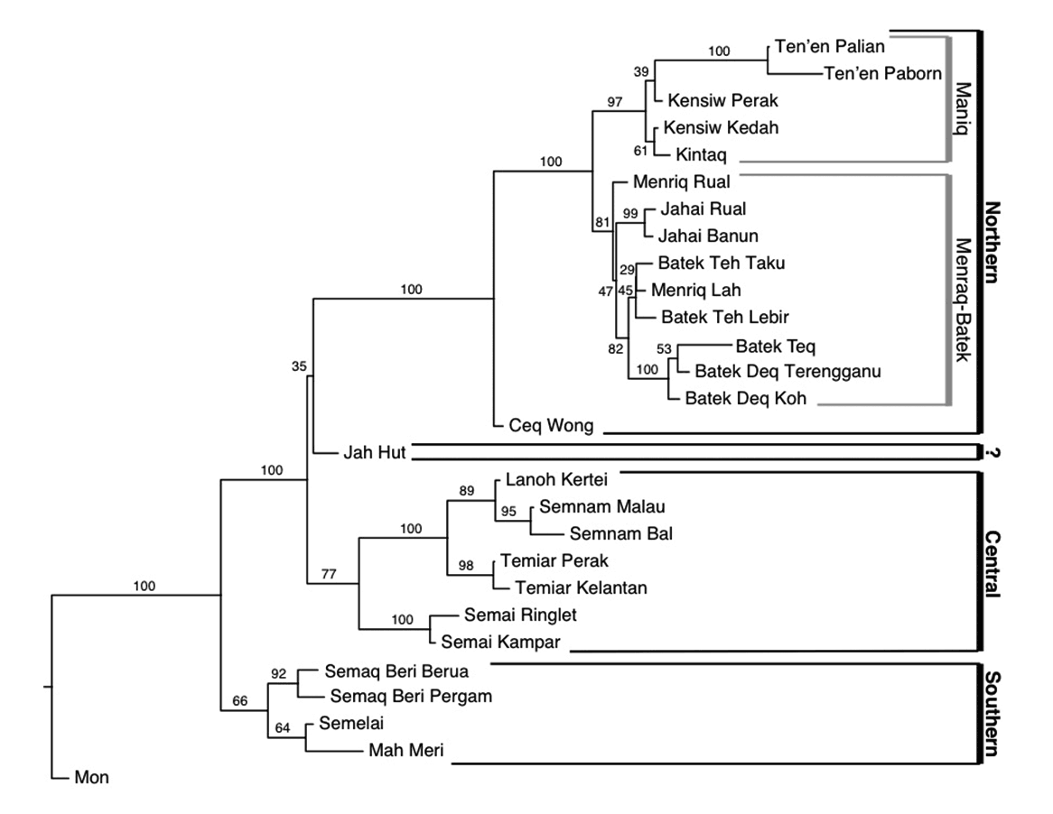 | 愛麗語支 Aslian | ●North(北部) ●Central(中部) ●South(南部) |