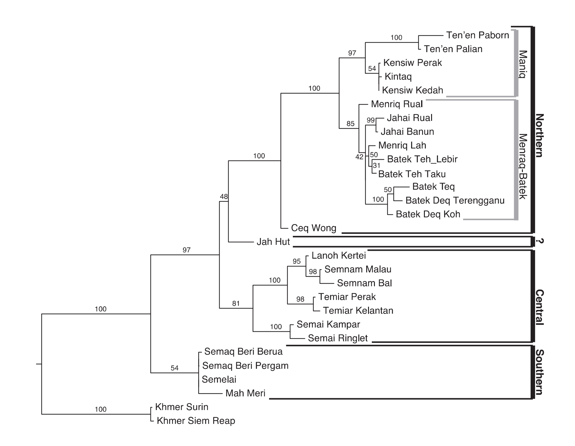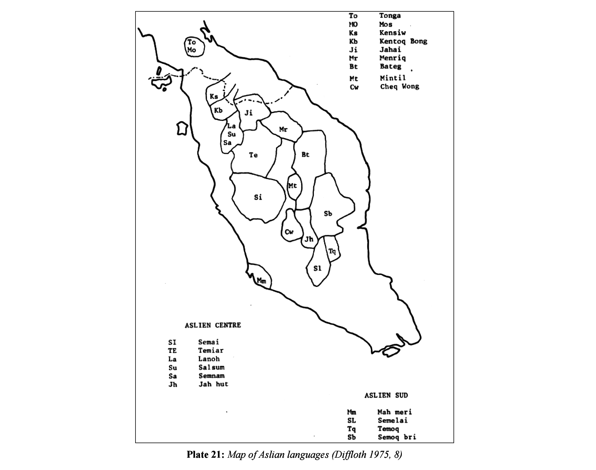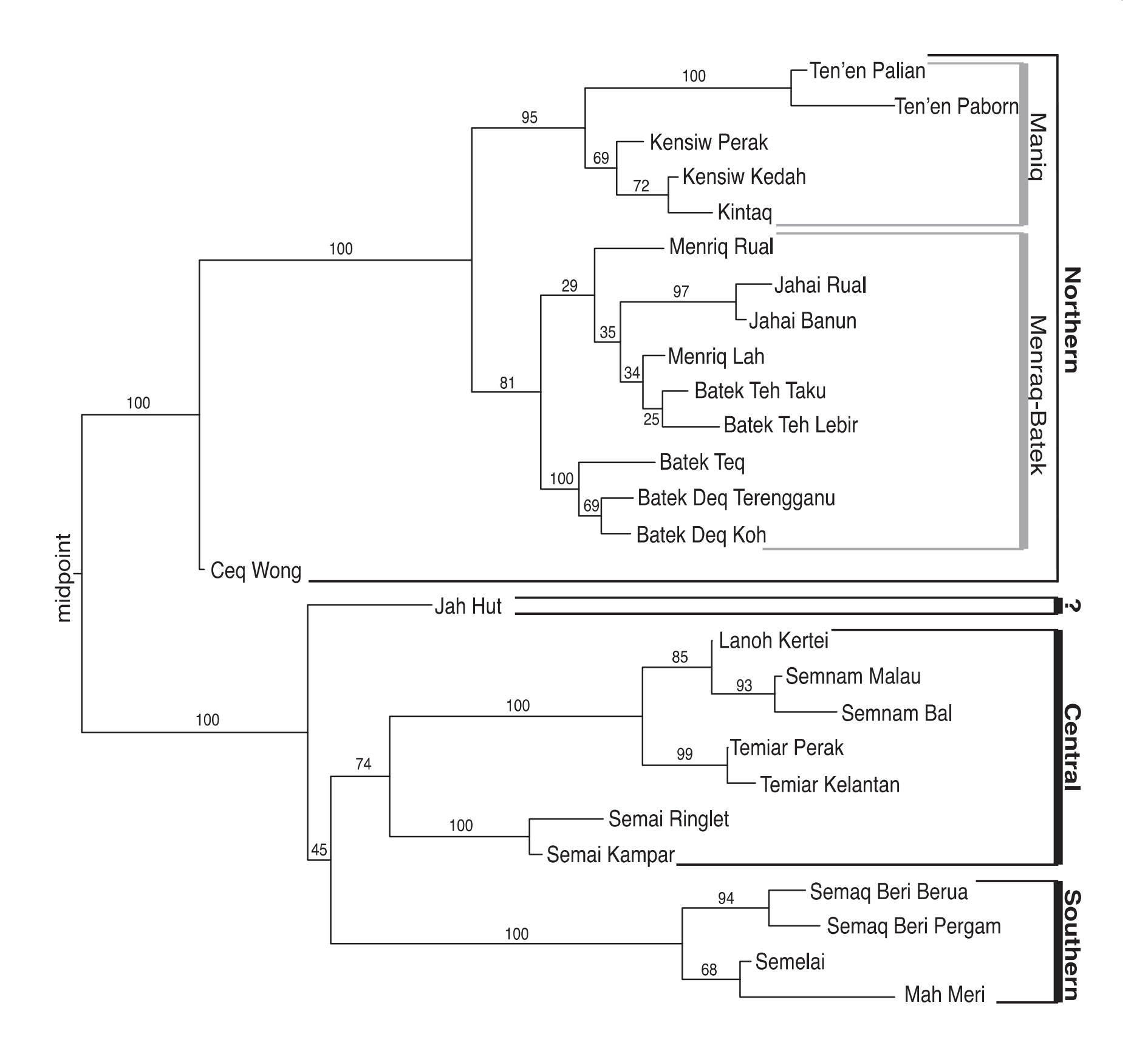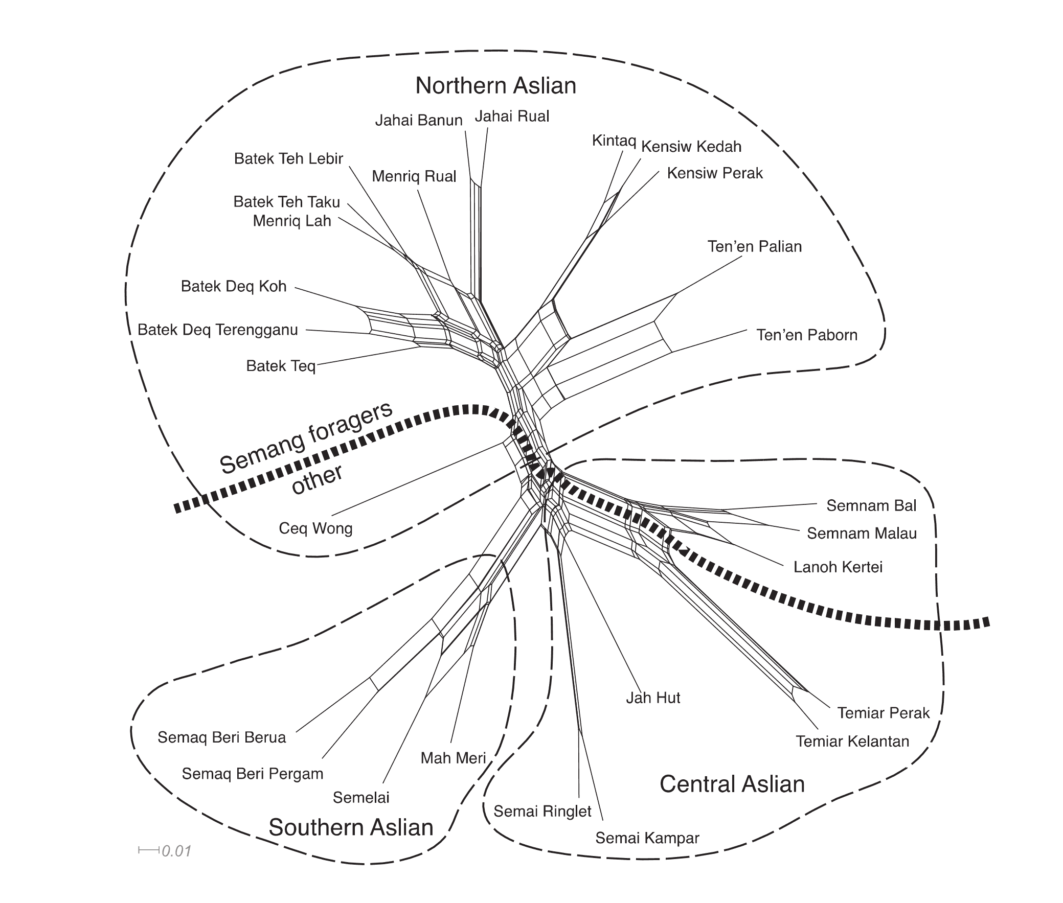 | 愛麗語支 Aslian | ●North(北部) ●Central(中部) ●South(南部) |