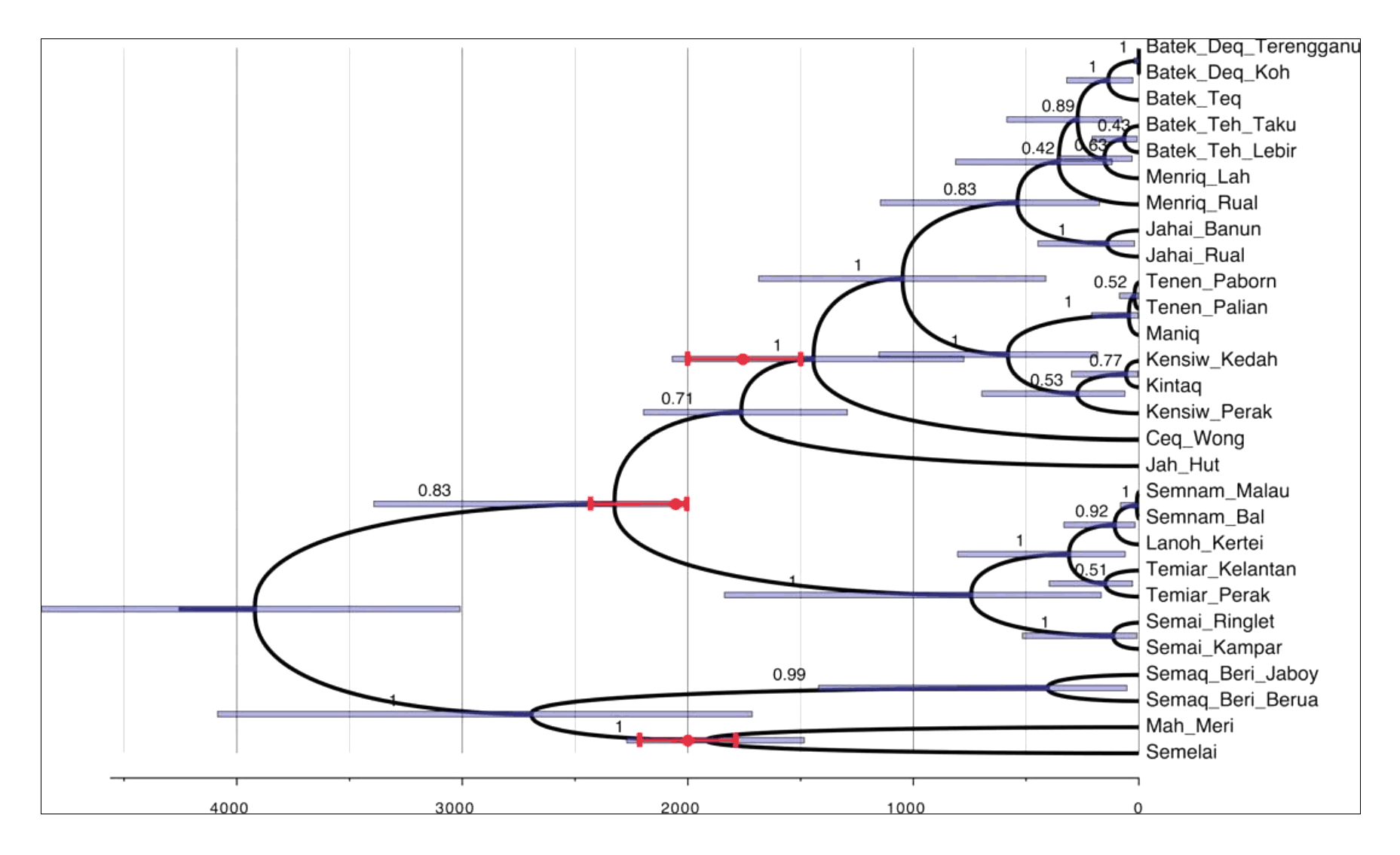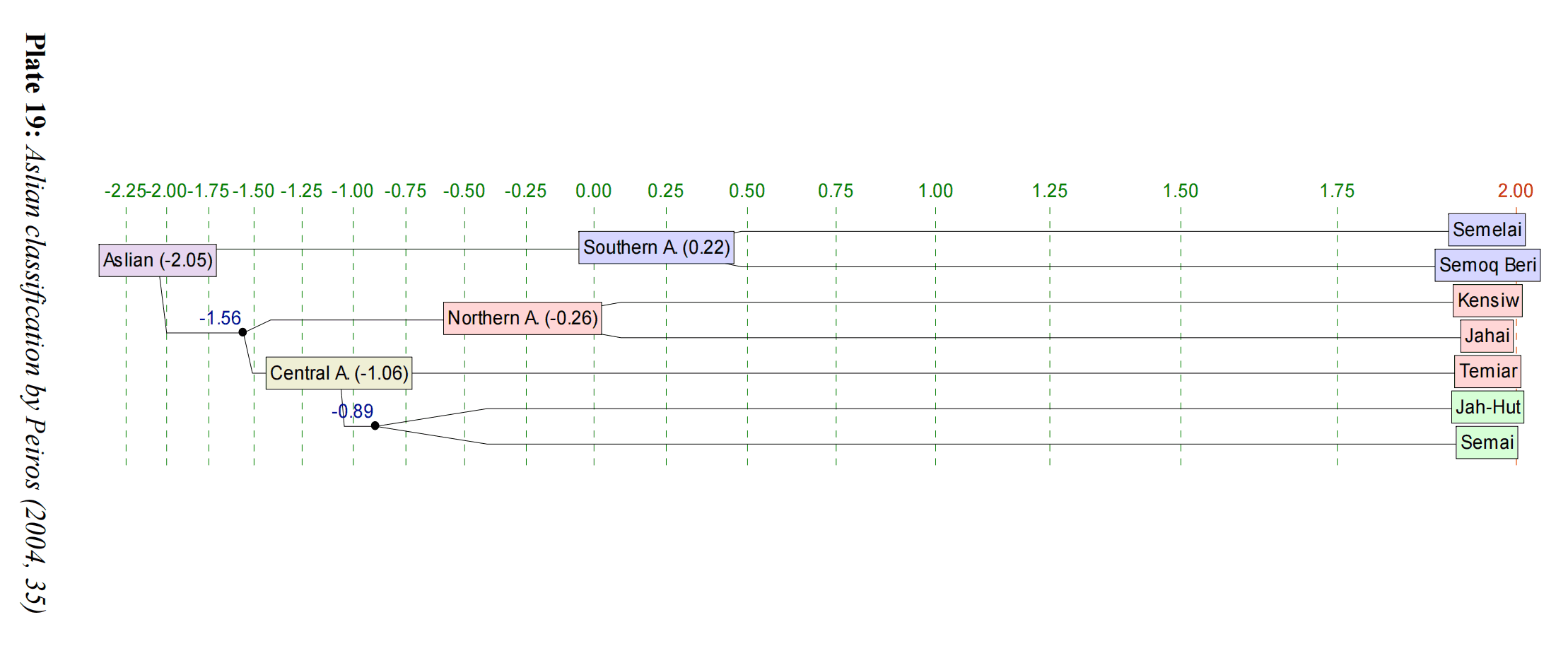 在中部-南部組裡,離群最大的是Semelai,這是唯一一筆南部語言。該樹形沒有新知識,都在學者們很早就知道的知識範圍內。 兩組材料的根時間值依據兩組語言中各語言兩兩語音對應強弱的中位數(其他語支也是如此,取中位數是為了避免特殊值的影響,如詞語借用造成的異常)。 該中位數是12.3%,折合成年代,得到愛麗語支的深度距今約3600年,在南亞語13語支中屬於中等水平。 這個結果和愛麗語支內部較低比例的基礎詞水平不吻合,3600年有點偏晚,基礎詞暗示的年代應在距今4000-5000年。可能的原因是,在愛麗語支內部,基礎詞的差異程度比正常語言高,或者說,普通詞的差異程度比正常語言低(推測、未驗證)。 由於愛麗語支跨人種、神秘文化,得到民族學、語言學的特別關注,在南亞語中是幸運的,這個語支有詳細的、高質量的分類研究(Dann等人、見附錄)。