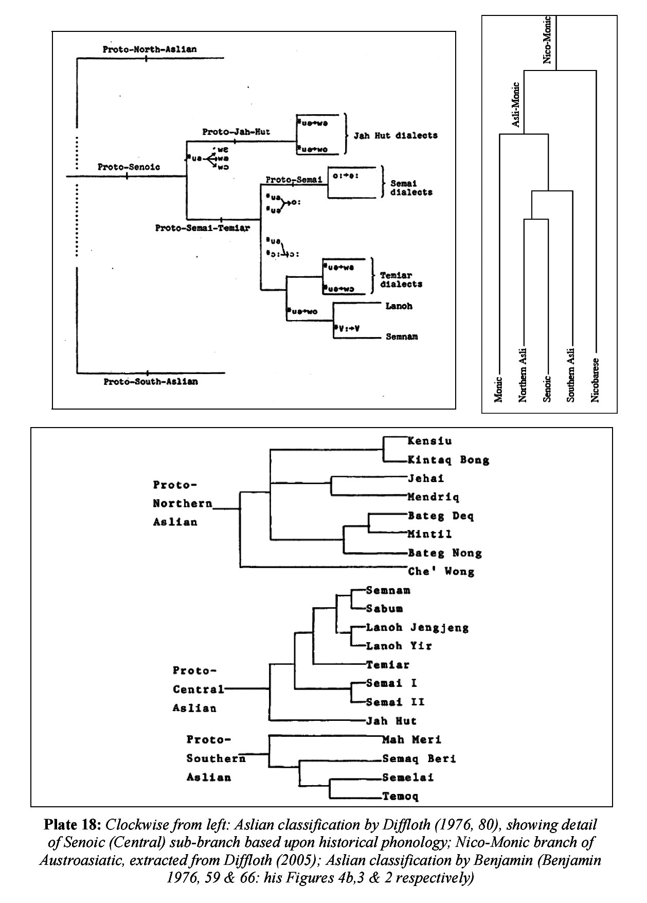 | 附:學者們的一些分類圖 | ![]() (1)愛麗語支分類三張(順時針依次是Diffloth 1976、Diffloth 2005、Benjamin 1976) ![]() (2)Matisoff的愛麗語支分類(2003) ![]() (3)Peiros的愛麗語支分類和年代推測(2004) ![]() (4)Dunn、Burenhult、Kruspe、Tufvesson、Becker 愛麗語支27語言146詞項的鄰居網絡 (2011) (圖中央的粗大虛線是賽芒人的分界,虛線上面是賽芒人,下面是非賽芒人。賽芒人常被劃為尼格利陀人、東南亞黑人,他們講的南亞語通常認為是歷史上學習、語言轉換而來) ![]() (5)Dunn、Burenhult、Kruspe、Tufvesson、Becker 愛麗語支27語言146詞項貝葉斯樹(2011) ![]() (6)Dunn、Burenhult、Kruspe、Tufvesson、Becker 愛麗語支27語言146詞項貝葉斯樹、加入外群孟語(2011) ![]() (7)Dunn、Burenhult、Kruspe、Tufvesson、Becker 愛麗語支27語言146詞項貝葉斯樹、加入外群克木語(2011) ![]() (8)Dunn、Burenhult、Kruspe、Tufvesson、Becker 愛麗語支27語言146詞項貝葉斯樹、加入外群高棉語 (2011) (以上四張圖的區別:圖5是純愛麗語支的貝葉斯樹,這是一種中點生根法,即樹的根被畫在两个最遙遠的類群的中间,圖6、圖7、圖8加入了外群語言,分別是孟語、克木語、高棉語,外群語言加入後,會改變愛麗語支的內部樹結構,原因是此時內群分支需重新協調和外群語言的關係,以生物學類比,當一個新物種被發現後,原先舊物種的分類關係可能被改變) ![]() (9)Dunn、Kruspe、Burenhult 有年代值的愛麗語支28語言146詞項貝葉斯樹(2013) ![]() (10)Skeat & Blagden 愛麗語支語言地圖(1906)(愛麗是半島土著居民,周邊沿海低地被後來的移民馬來人佔據) ![]() (11)Diffloth 愛麗語支語言地圖(1975) ![]() (12)Benjamin 愛麗語支語言地圖(2004) ![]() (13)Dunn、Burenhult、Kruspe、Tufvesson、Becker 愛麗語支語言地圖 (2011) ![]() (14)Benjamin、Geoffrey 愛麗語支語言地圖 (2012) ![]() (15)Dunn、Kruspe、Burenhult 愛麗語支語言地圖 (2013) 出處: 圖4-8/13:Dunn、Burenhult、Kruspe、Tufvesson、Becker《Aslian linguistic prehistory: A case study in computational phylogenetics》2011 圖12/14:Benjamin、Geoffrey《The Aslian languages of Malaysia and Thailand: an assessment》2012 圖9/15:Dunn、Kruspe、Burenhult《Time and Place in the Prehistory of the Aslian Languages》2013 圖1-3/13-15:Paul Sidwell《Classifying the Austroasiatic languages: History and state of the art》 2009