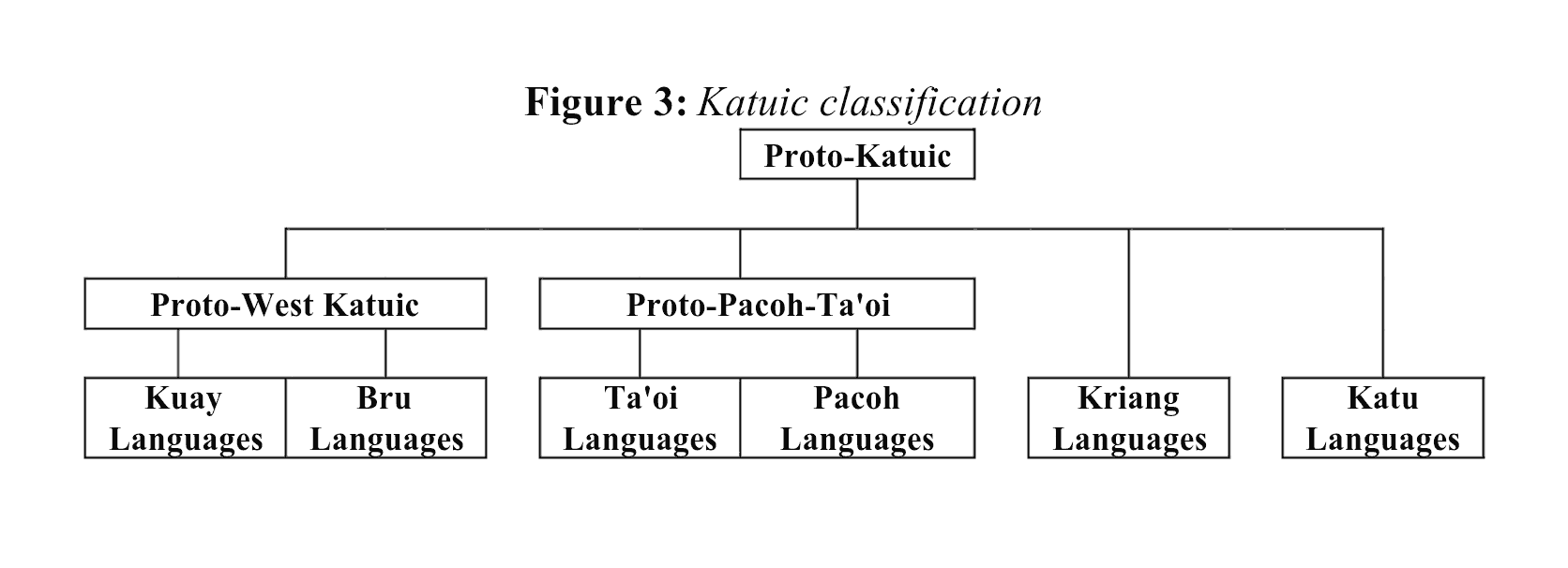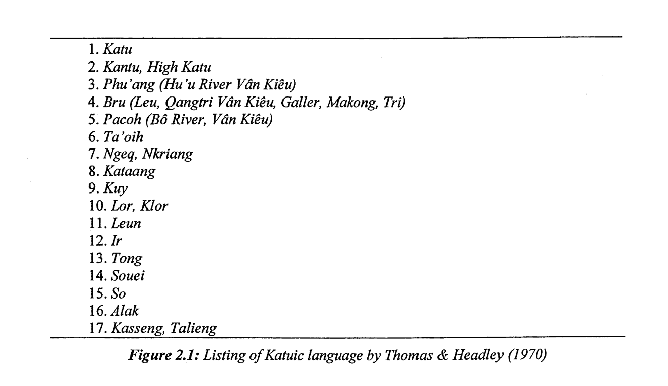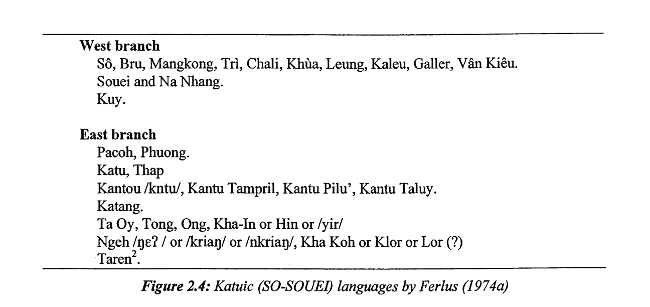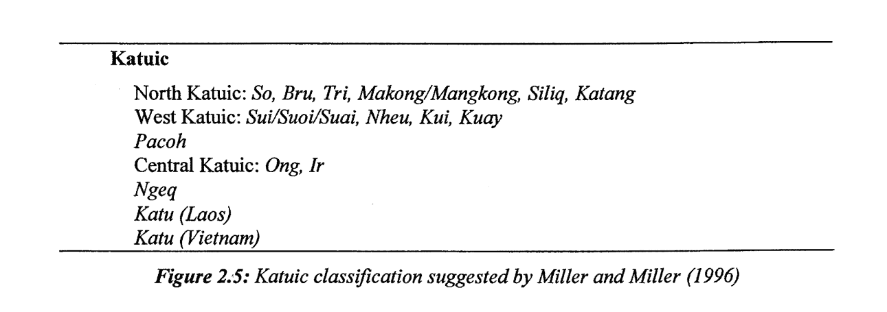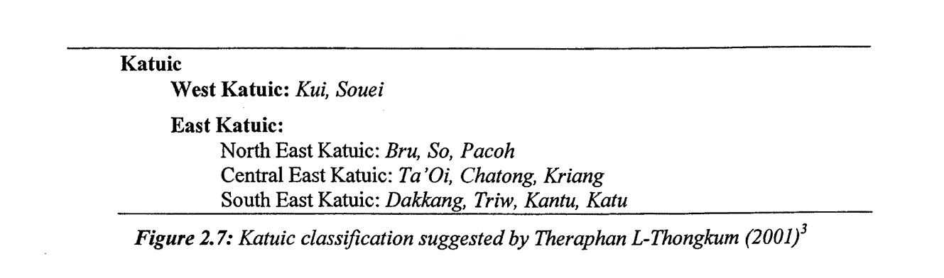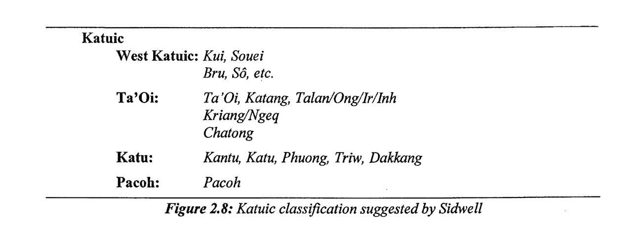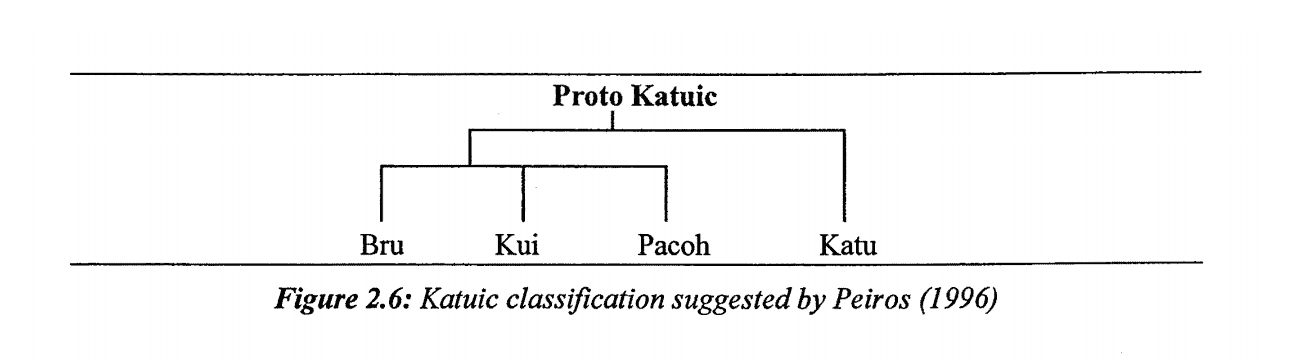 | 附:學者們的一些分類圖 | ![]() 圖1:Thomas、Headley識別出的卡都語支語言列表,1970年。(Thomas是卡都語支的發現者之一、第16、17的三個語言現在劃在巴那語支) ![]() 圖2:Ferlus的卡都語支分類,1974年。 ![]() 圖3:Miller and Miller的卡都語支分類,1996年。(依據詞彙統計、50個卡都語單詞列表) ![]() 圖4:Peiros的卡都語支分類,1996年。(依據詞彙統計) ![]() 圖5:Theraphan L-Thongkum的卡都語支分類,2001年。 ![]() 圖6:Sidwell的卡都語支分類,2005年。(依據歷史語音創新、音變) ![]() 圖7:Ryan Gehrmann的卡都語支分類,2019年。 ![]() 圖8:Sidwell卡都語支語言和分佈圖,2005年。 出處: 圖1-6:Sidewell《The Katuic Languages: Classification, Reconstruction & Comparative Lexicon》 2005 圖7:Ryan Gehrmann《On the Origin of Rime Laryngealization in Ta'oiq: A Case Study in the Phonatory Restructuring of Vowel Quality Contrasts》 2019 圖8:Sidewell《PROTO-KATUIC PHONOLOGY AND THE SUB-GROUPING OF MON-KHMER LANGUAGES》 2005