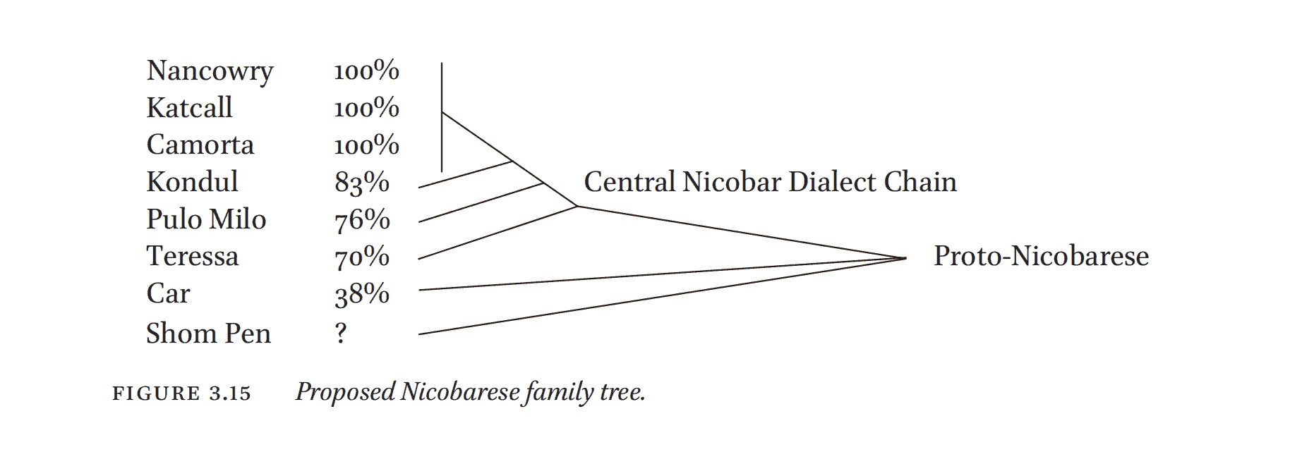 | 附:尼科語支印象 | 一、內部差異半萬年 這是一群印度洋小島上的南亞語,它北面是著名的人類學禁區安達曼島人。不同於安達曼島黑人,他們是黃種人。 尼科語支南北兩個語言的對應詞比例很小,折算成時間是5200年,這已接近湄公河語支間的差異(如孟-高棉-巴那),它倆如果分佈在兩個地方,那麼都將是獨立語支。 有兩種可能: ① 南北語言是兩批完全不同的移民。 ② 同一批移民經過久遠的分化形成南北兩語。 由於在其他地方找不到任何和兩北兩語有明顯接近的南亞語,所以②的可能性較大,該解釋也更簡潔。如果此說正確,那麼南亞語的擴散早而迅速,在半萬年前就登陸到遠離大陸的印度洋小島上。 二、最孤立的語支 Diffloth的2005年的南亞語分類樹上尼科語支-孟語支同組,Sidwell的2015年的南亞語平行分類中尼科語支-愛麗語支同組。從古音小鏡的結果看,這兩個組的相似程度都很微弱,尼科語支和其他13語支都非常疏遠,語音對應比例都是最低水平,找不出明顯的相似者。 在南亞語14語支中,尼科語支是最特異的,超過印度本土的蒙達語支,也超過馬來半島黑色皮膚塞芒人的語言(屬愛麗語支),如果把南亞語比作太陽系,那麼尼科語支相當於冥王星。語言學者很早就知道尼科語支的特異性,Peiros的2004年的南亞語分類樹將尼科語支放在第一根分支是比較合理的安排,這裡的數據也支持這樣。 站長 2025-3-22 |