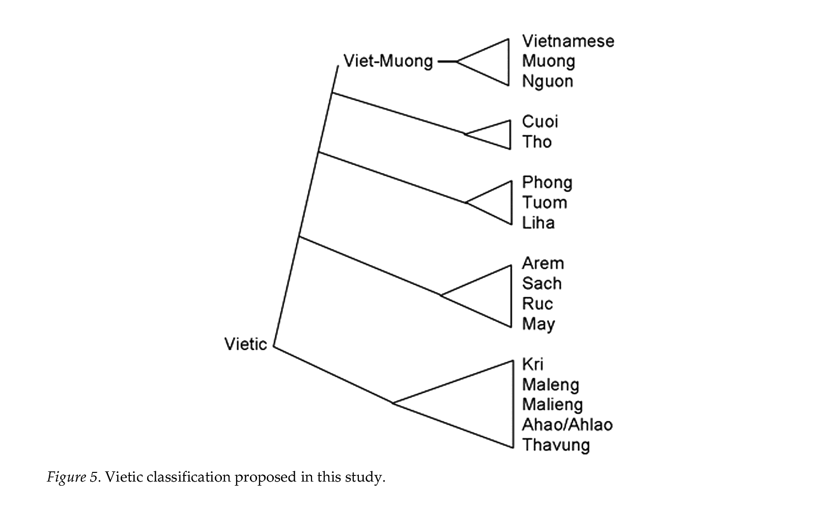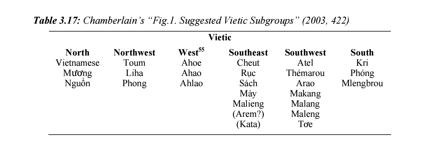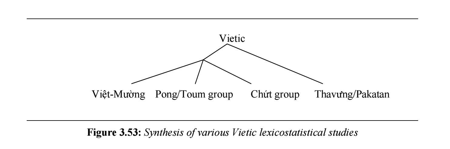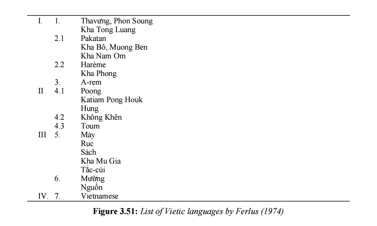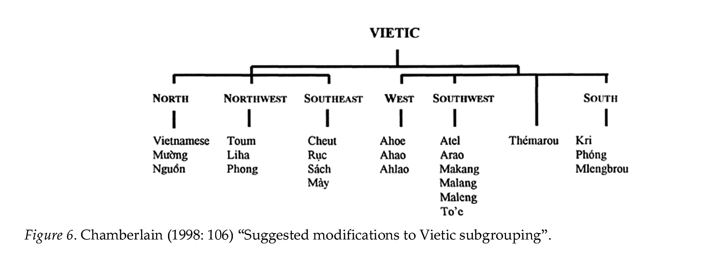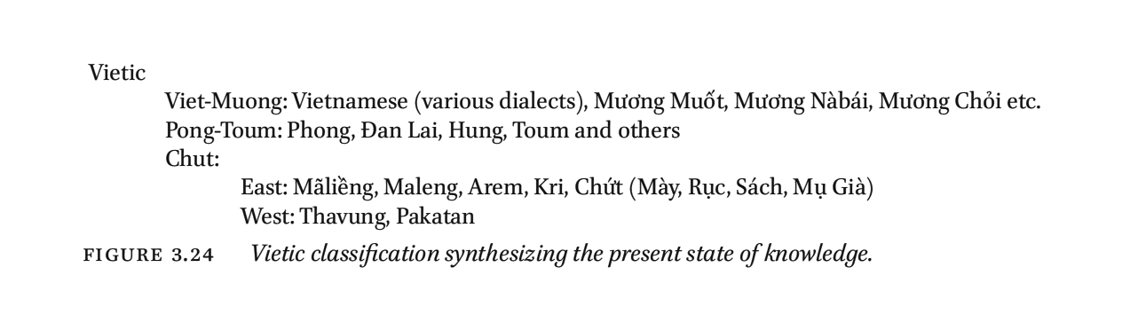 | 越語支 Vietic | ●Vietnamese(京) ●Muong(芒) ●Tho(土) ●Pong(奉) ●Chut(哲) ●Maleng(瑪楞) ●Thavung(他文) |