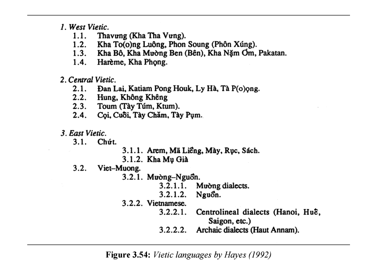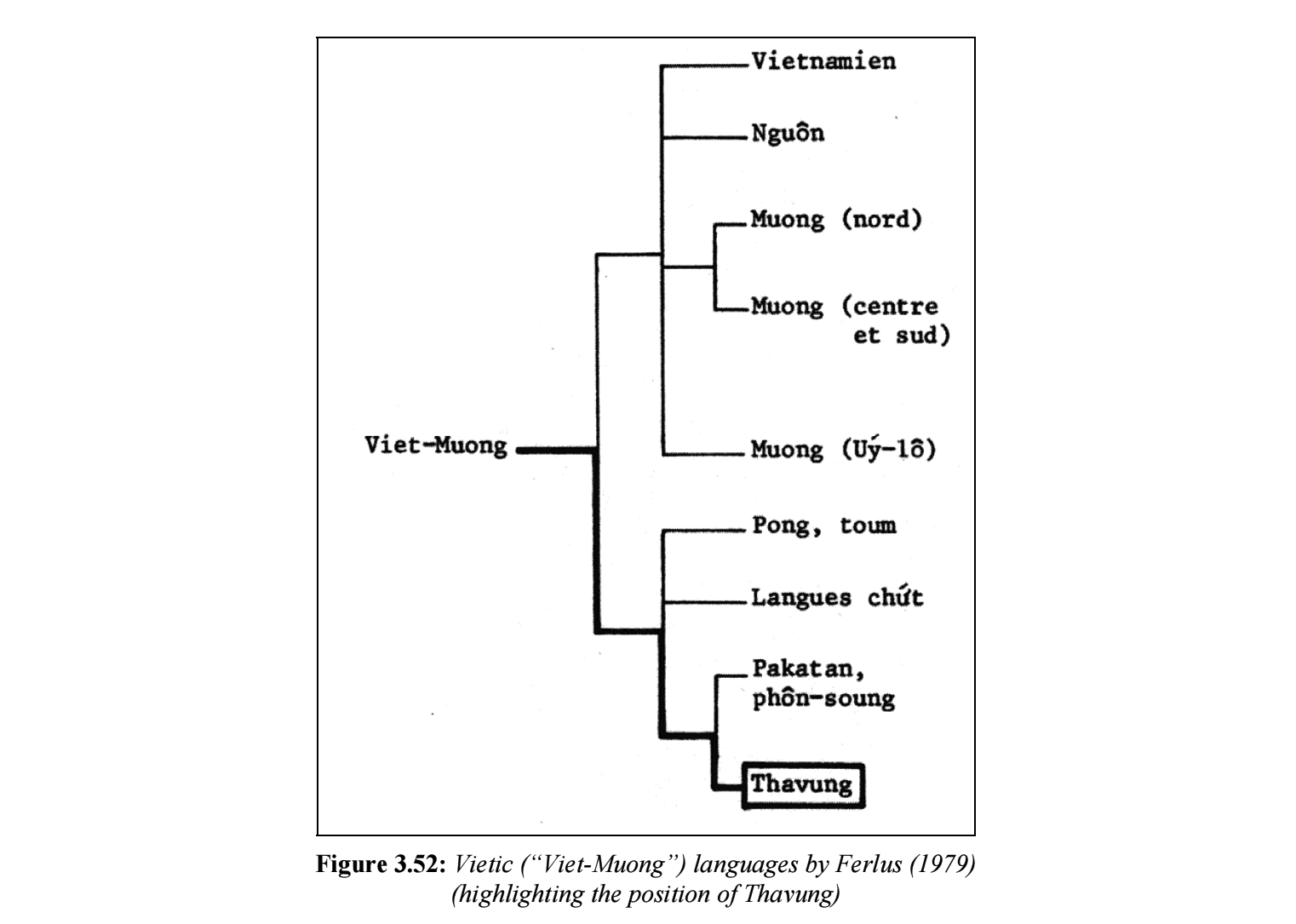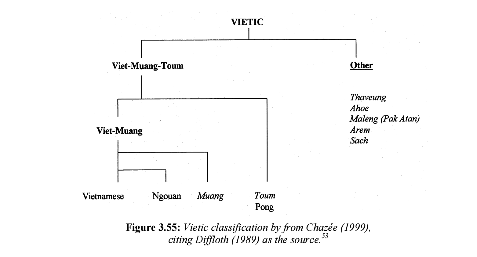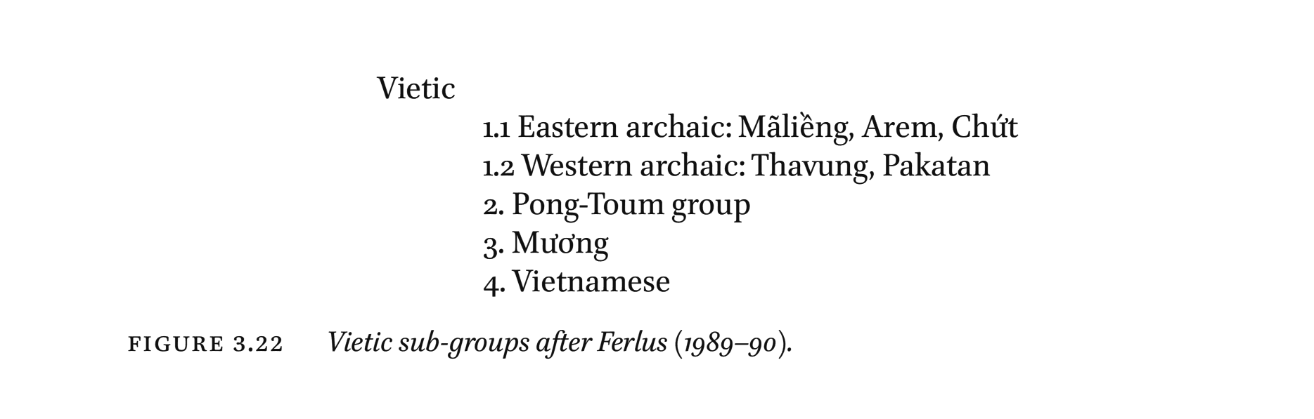 | 越語支 Vietic | ●Vietnamese(京) ●Muong(芒) ●Tho(土) ●Pong(奉) ●Chut(哲) ●Maleng(瑪楞) ●Thavung(他文) |