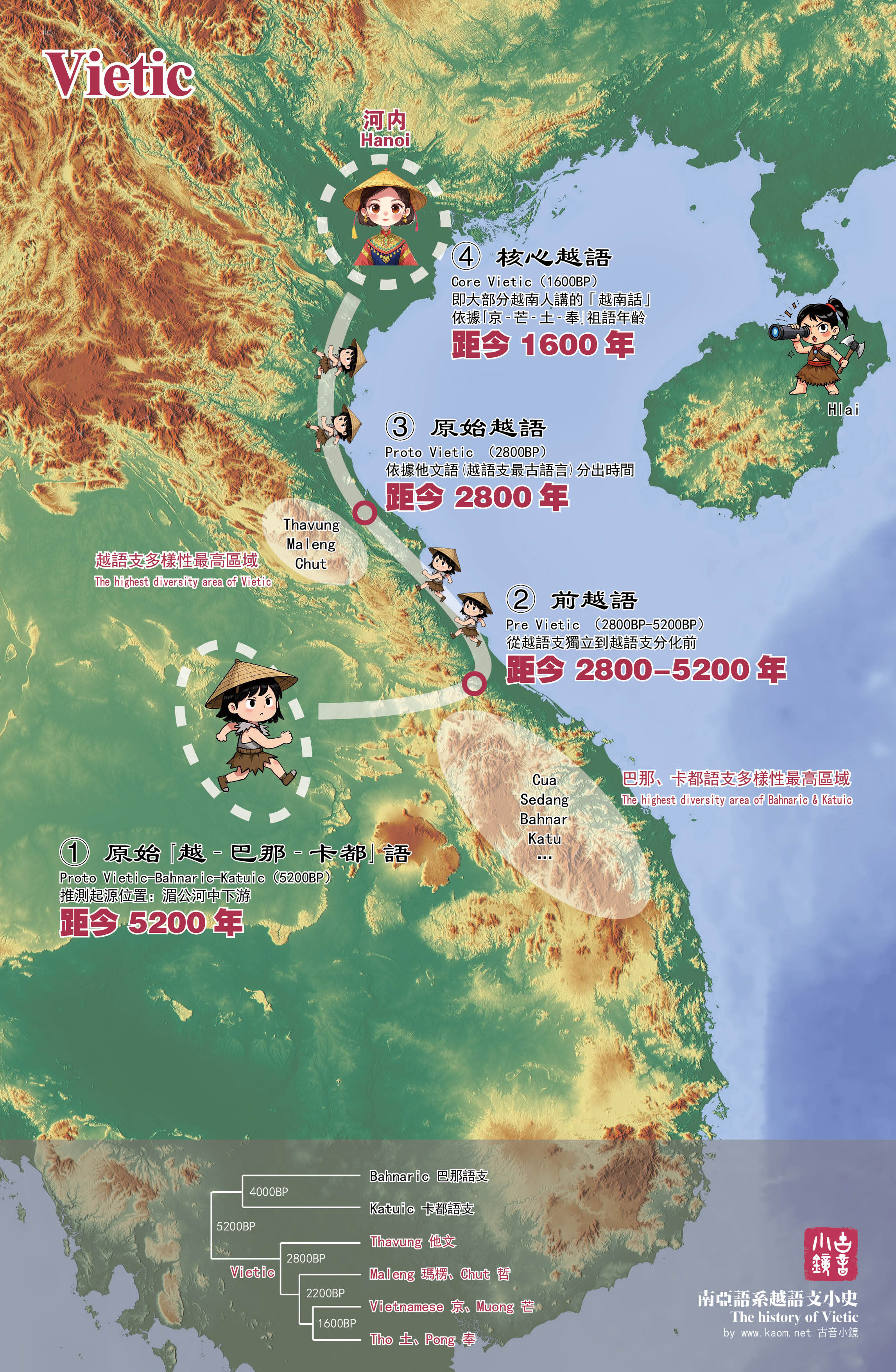| 附:越語支印象 | 一、關係分析 通過以下四步來安排關係樹: ① 在「南亞語對應詞表」上,越語支最異質語言是他文語,它離群最遠,應位於關係樹最根部。 ② 瑪楞組和哲組離群次遠,應位於關係樹次根部,但它倆可以類聚,結成一對各自多樣性都很高的鬆散伴侶。 ③ 剩下的語言是一個親密團體:京-芒-土-奉,它是越語支的核心,也最人多勢眾的語言。 ④ 在核心「京-芒-土-奉」中,如果站在京組(河內話)的角度上,最親近者顯然是芒組,最疏遠者是奉組,土組介於它倆之間,樹中用虛線表示。 但樹不能覆蓋以下現象: ① 奉組和他文組有稍明顯的相似性,這應是地理臨近的自然現象。 ② 京芒組-土組-奉組三者形成連讀體,關係樹不善於表達語言連續。 越語支分類最新的重要成果是2021年Sidwell & Alves的依據116個詞項的28種語言關係樹(見附圖11-13),其中瑪楞語,該樹和他文組聚類,這裡的樹和哲組聚類,這是最大的不同,其他地方大部分相同、相似。 (越語支數據的特殊對待:該語支數據大部分來自Ferlus,他構擬了原始越語支,這些數據很整齊,大部分是單音節核心語素,因此計算所得的語音對應數值很高。在建立關系樹以及確定時間時,對這些數值進行了折算,其中非Ferlus數據起到了定位的作用,這樣可以和其他語支保持年代上的一致,這有助於糾正誤差,是和其他13語支關系樹不同的地方。) 二、內外歷史尺度 以統一的折算時間,越語支內部深度約2800年,越語支最親近語支是「卡都-巴那」,兩者相距5200年,在中間2400年空擋裡,越語支沒有親屬語言,或者有親屬語言但沒有傳下後代。現存的所有越語支語言都是距今約2800年前同一個祖先傳下的。越語支有足夠長的空檔產生創新,使其個性鮮明——它的特點不僅在吸收漢語方面。 越語支和北面(尤其今中國境內)的南亞語鄰居是否親近呢?比如倈語、布甘語、莽語(不是芒語)、布芒語(也不是芒語)、布興語、欣門語等。以古音小鏡同樣的折算標準,越語支和它們的差異都在6500年以上,是很遙遠的、不親近的。 這些語言和越語支長期生活在共同的漢字文化圈下,接受了相似的影響,包括詞彙更替、音系發展,使得它們有限趨同。將這些語言和越語支聯繫起來,中國前輩學者有「越芒語族」的提法,在知網的學術論文裡影響深遠。在古音小鏡反映基本關係的語音對應方法裡,它們的關係薄弱,不能類聚成一個更高層級的上位語族,它們和越語支的親近程度不如南部的巴那語支、卡都語支,「越芒語族」的提法在這裡不能被證實。 三、越語支起源推測 這裡對越語支起源進行推測:從湄公河中下游翻過長山山脈到達越南中部再沿海岸線往北擴散至紅河三角洲。 依據是: ① 越語支關係最近的巴那語支、卡都語支在南面(故占婆國境)。 ② 越語支多樣性在南面(故大越國南疆)。 從多樣性推測起源地會有例外,如漢語,所以②是次要證據,①是主要證據,下面畫了一張示意圖: ![]() 四、4個歷史階段的解釋 越南語的起源是個迷,「4個歷史階段」是一種推測,提供一種符合古音小鏡「南亞語對應詞表」的解釋。當然,這只是一種視角,有待語言學家、歷史學家驗證。 ① 原始「越-巴那-卡都」語(Proto Vietic-Bahnaric-Katuic、距今5200年) 越語支最親的語支是誰?「南亞語對應詞表」裡是巴那語支和卡都語支,數值5.7%和6%,較明顯高於其他語支(其他語支都小於4.4%,數值都是語支間中位數)。一般會注意到,巴那、卡都語支的部分語言在今越南境內,是否因越南國家語言影響所致?對此,我仔細查看了它倆在老撾、柬埔寨境內的語言,數據結論是相同的:它們和越語支同樣親密,可以排除國家語言的影響。另外,古代越南疆域只限於北越南,巴那、卡都語支的主體不在此範圍,過去它們很少接觸。 哈夫曼、Sidwell兩位學者曾提出,巴那、卡都語支和其他語支的同源詞比例總是高於後者之間,它倆表現為「中心語支」(是南亞語湄公河起源說的一個證據)。這個現象裡,巴那、卡都語支像一個大太陽,照耀全部南亞語。這是否對「越-巴那-卡都」的設想不利呢?我仔細觀察了這個問題,如果站在巴那、卡都語支觀察,在對應表中查詢,和它倆明顯最親近的三個語支分別是孟、高棉、越,考慮到孟、高棉是古代中南半島的強盛文明,對周邊民族產生文化輻射,造成語言趨近,這是可以解釋的,而越語支沒有這個能力,因此「越-巴那-卡都」仍然是有把握的。 認為越語支和巴那、卡都語支的親密性是基本的、古老的,推測存在一個「越-巴那-卡都」祖語。 其中,「越-卡都」不是新見,2005年Diffloth的南亞語分類樹中已提出,2015年的《南亞語手冊》對此有質疑(第174頁)。這裡從語音對應的角度觀察,認為「越-卡都」足夠親密,此外還證實「越-巴那」同等親密,層次結構是「越-[巴那-卡都]」。 此時地理位置,主要依據「卡都-巴那」祖語位置(見②)和姐妹旁支「孟-高棉-比爾」位置,推測在湄公河中下游平原。這是很粗糙的,這片範圍很大,還沒有思路把它縮小。 ② 前越語(Pre Vietic、距今2800-5200年) 這是從越語支獨立到越語支分化前的歷史,長達2400年,期間產生的語言分支已全部消亡。 語支會走動,如何確定其古代地點? 很湊巧,巴那語支是南亞語裡多樣性最高的語支,有30-40個語言,在它東北區域,能找到3個彼此差異接近4000年的語言:戈語、瑟當語、巴那語(狹義的),而且距離不遠,在200公里範圍內,這可以